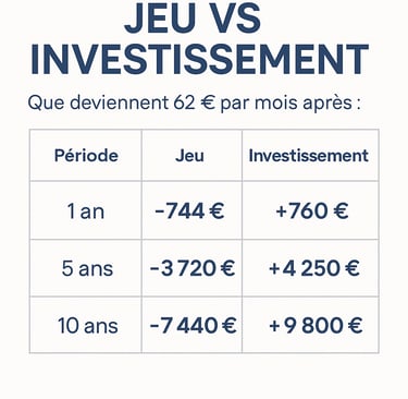 Chaque jour, des millions de Français cherchent à “améliorer leur vie” sans vraiment changer leurs habitudes. Ils rêvent de liberté financière, mais investissent leur argent… dans l’espoir, pas dans la connaissance. Selon l’Autorité nationale des jeux (ANJ), près de 38 millions de Français ont joué au moins une fois en 2024, et 1 joueur sur 3 joue chaque semaine. En moyenne, un joueur régulier dépense 62 € par mois — soit 744 € par an. À première vue, ce n’est pas grand-chose. Mais si ces mêmes 62 € étaient investis chaque mois, le résultat sur un an raconte une autre histoire.